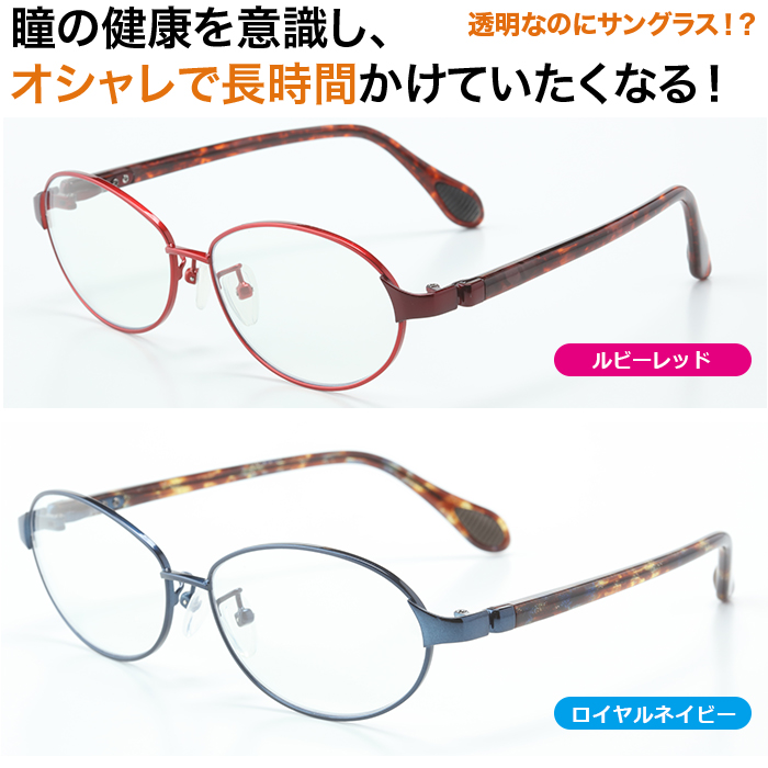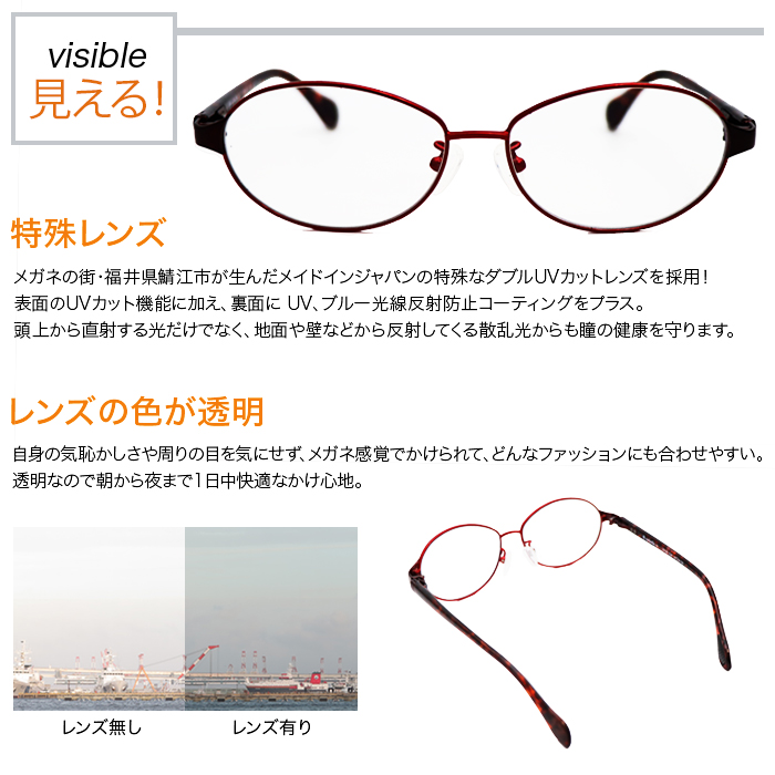 フレーム:ステンレス(めっき・コーティング)、ツル:プラスチック、レンズ:プラスチック(コーティング)