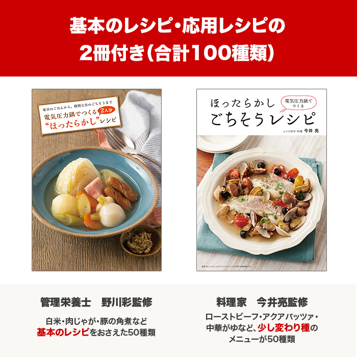 本体、計量カップ、しゃもじ、蒸し皿、蒸気水受け、安全弁おもり(ふたにセット済み)、電源コード、レシピブック×2冊(「ほったらかし ごちそうレシピ」「電気圧力鍋でつくる"ほったらかし"レシピ」)、予備用浮き圧力弁シール2個(同封注意書に添付)、取扱説明書(保証書付)