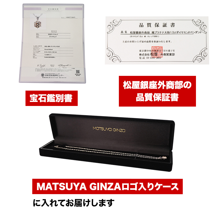 純プラチナ1ctダイヤモンドペンダント×1、鑑別書×1、品質保証書(松屋銀座外商部発行)×1、ロゴ入りケース×1