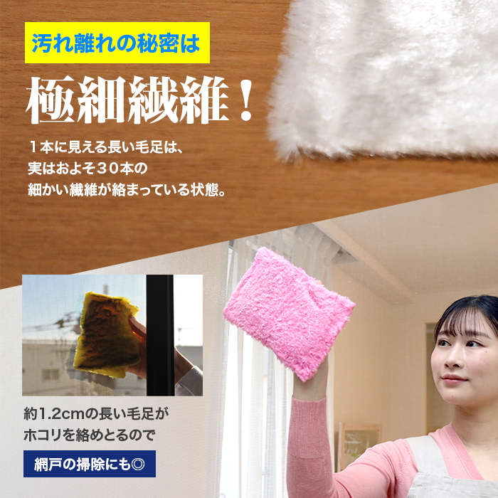 ●水に濡らした後、よく絞ってからご使用ください。●ご使用後は、拭き取った汚れ等をすぐに水洗いしてください。★付いた汚れをすぐに洗い流して頂くことによって、長く綺麗な状態を保つことができます。もし、汚れが落ちづらい場合には、家庭用洗剤や洗濯機で洗ってください。★研磨力のあるものではありませんので、対象物を傷つけるようなこともありません。●一般的なフキンと同じようにお使いください。水拭きできる場所ならどこでもお使い頂けます。●熱に強いので、濡らしてからコンロ周りの吹きこぼれや油の飛び散りを熱いうちに拭き取ることができます。また、鍋敷や鍋つかみ代わりにもご使用頂けます。但し、ヤケドには充分お気を付けください。●毛足が長いので、網戸などのお掃除の際、片面から拭いて両面拭き上げることもできます。●汚れが落ちづらい場合には、洗剤と併用してお使いください。