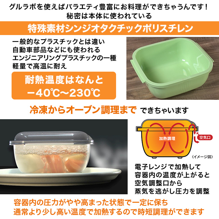 ※本品はレンジ加熱およびオーブン(電気式、設定温度が230℃以下に限る)加熱のみに使用できる調理器です(フタはオーブンでの使用不可)。直火、オーブントースター及びグリル機能、など他の熱源での使用はできません。※内容物がもれるおそれがありますので、横にしないでください。※持ち運ぶときは、フタを持たないでください。※製氷機を目的として使用しないでください。※火に近づけないでください。※汚れが付着したまま使用すると、容器がコゲつく場合ありますので、使用後よく洗ってください。 ※電子レンジの種類及び使用年数によっては、加熱時間が異なる場合があります。 ※電子レンジ調理にご使用の際は、フタを「加熱調理」のポジションに合わせてください。フタの向きを誤ると、正しく調理できない場合があります。 ※電子レンジの表示、取扱説明書を確認してから、ご使用ください。*耐熱温度を超える熱が加わると、変形や溶融が起こり、使えなくなります。また、耐熱温度を超えて加熱が継続されると、発煙や発火に至る危険がありますので、以下のような加熱はしないでください。