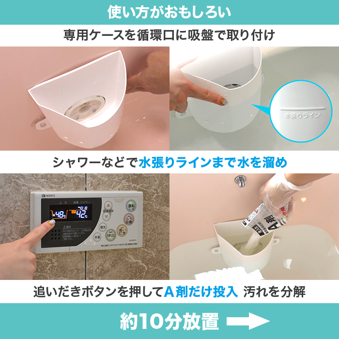※ただし、2つ穴でも追いだき機能があり、1つ穴が塞いである場合はご使用いただけます。※ジェットバス、24時間風呂も追いだき機能があれば洗浄可能ですが、機種によって使用方法が異なる場合があるため、メーカーにお問い合わせください。※エコキュートは追いだきすると貯湯タンク内のお湯の量が減少し、残量が少なくなるとリコモンに「残湯なし」「追いだき不可」等のエラーが表示されて追いだきが停止することがあります。ご使用前に必ず貯湯タンクを満タンにしてから追いだきを開始してください。