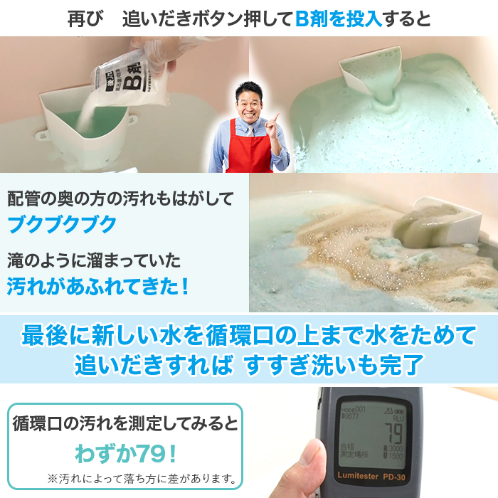 用途以外に使用しない。塩素系や他の薬剤と混合しない。保護具(炊事用手袋、マスク、保護眼鏡等)を着用して使う。換気を良くして使う。開封後は1回の使用で全量を使い切る。使用の際は粉や液が目に入らないように注意する。粉を吸い込まないように開封投入の際には気をつける。乳幼児やペットの手の届かないところに保管する。認知症の方などの誤食に気を付ける。直射日光や高温多湿を避け、袋をしっかり閉じ、冷暗所に保管する。火のそばには置かない。※B剤には袋が膨らまないよう穴を開けています。※保管環境により粉剤に褐変や固化が生じることがありますが洗浄力は変わりません。固化した場合は、ほぐしてからご使用ください。※汚れの度合い、種類によって排出される汚れの量や色に差が出ます。※洗浄時に付着した汚れを放置すると、汚れの色が浴槽に移る場合があります。汚れが浴槽に残る場合は、スポンジ等でこするなど、しっかりと洗い流してください。
