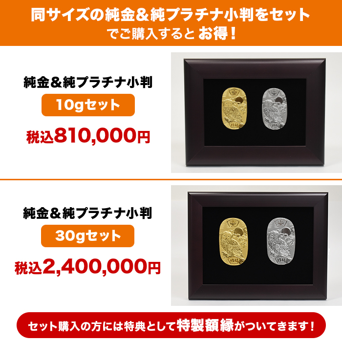小判×2(純金・純プラチナ×各1枚)、品質保証書×2、額縁×1