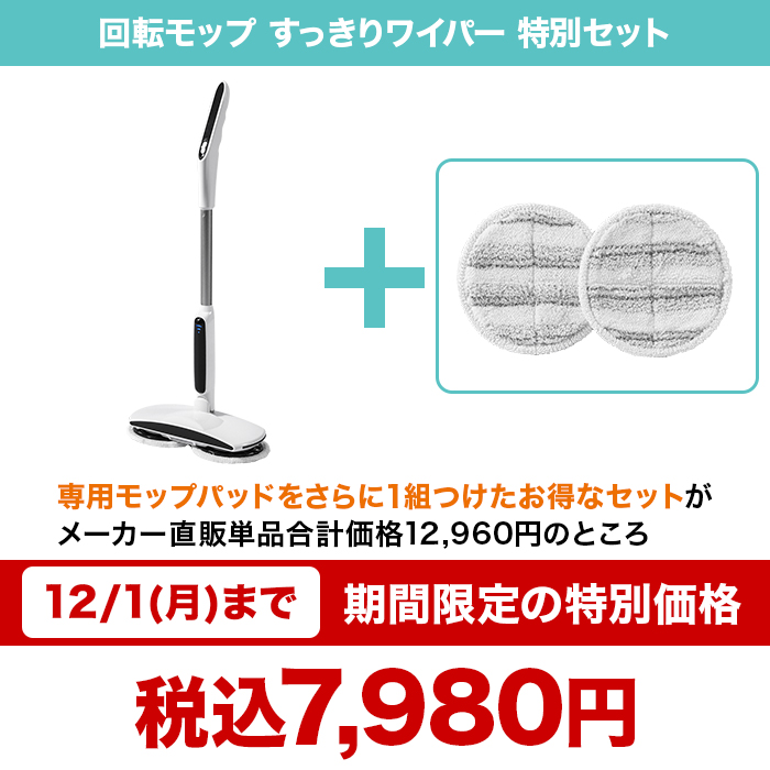 本体(充電式バッテリーセットアップ済)×1、グリップロッド×1、延長ロッド×1、専用USB変換アダプター×1、専用充電コード×1、専用モップパッド(1組2枚)×2、取扱説明書(保証書付き)