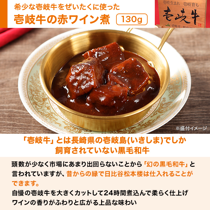 壱岐牛の赤ワイン煮:牛肉(国産)、デミグラスソース(デキストリン、小麦粉、砂糖、その他)、ワイン濃縮調味液、果実酒、バター/調味料(アミノ酸等)、増粘剤(加工でん粉)、カラメル色素、酸味料、(一部に小麦・乳成分・牛肉・大豆・鶏肉・豚肉を含む)