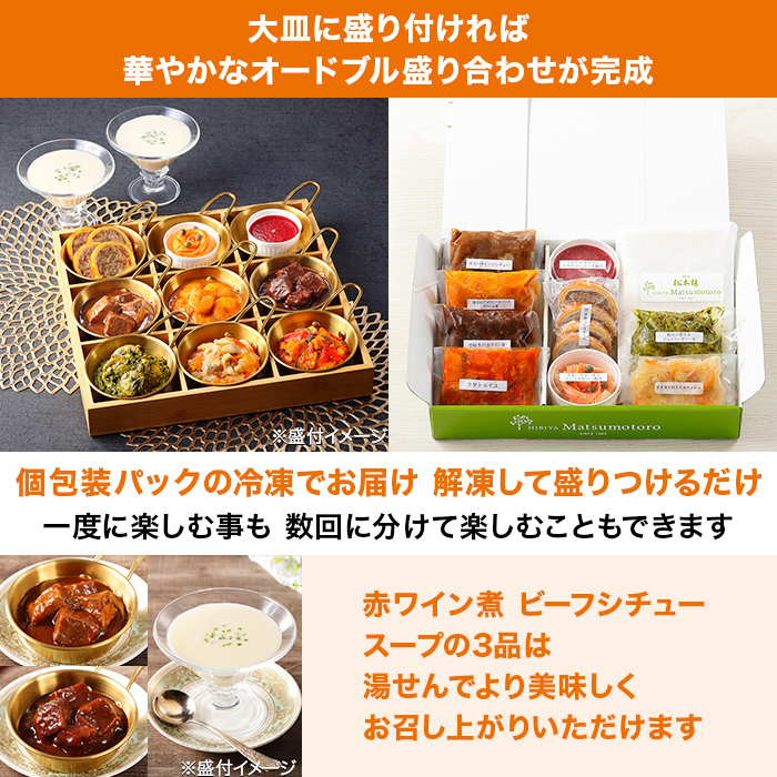 黒毛和牛ビーフシチュー130g、壱岐牛の赤ワイン煮130g、海老のアメリケーヌソースクリーム煮6尾(100g)、帆立の葱生姜ジェノベーゼソース4個(80g)、松本楼アンクルート4枚(70g)、イトヨリのエスカベッシュ60g、ラタトゥイユ60g、スモークサーモントラウトフラワーコンソメゼリー添え30g、フォアグラプリンラズベリーソース掛け70g、じゃがいものスープ170g×2