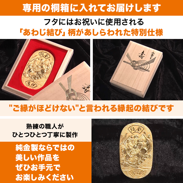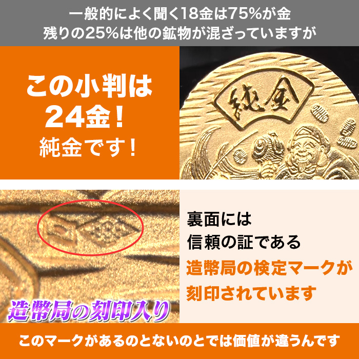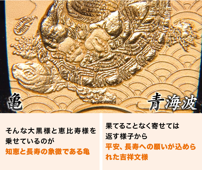 福の神の代表 大黒恵比寿の朗らかな表情が縁起の良い純金製小判手がけるのは金・銀・貴金属工芸加工において高い技術を誇り、