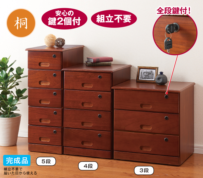 通帳や印鑑・マイナンバーカードなど、貴重品をまとめて保管できる全段鍵付のチェストです。