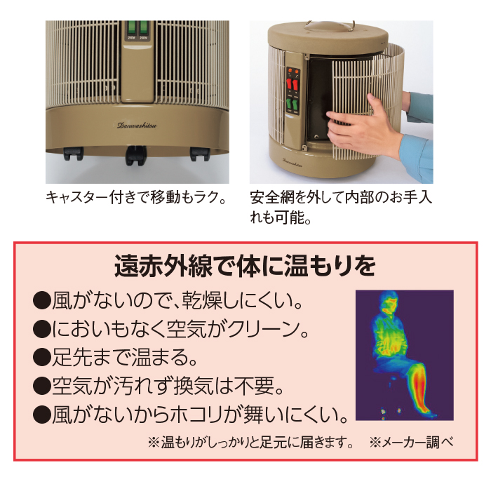 本体:鋼板(ポリエステル樹脂系粉体塗装)、遠赤外線放射板:ホーロー、ガード:スチール(めっき)、トップカバー・キャスター:ABS樹脂