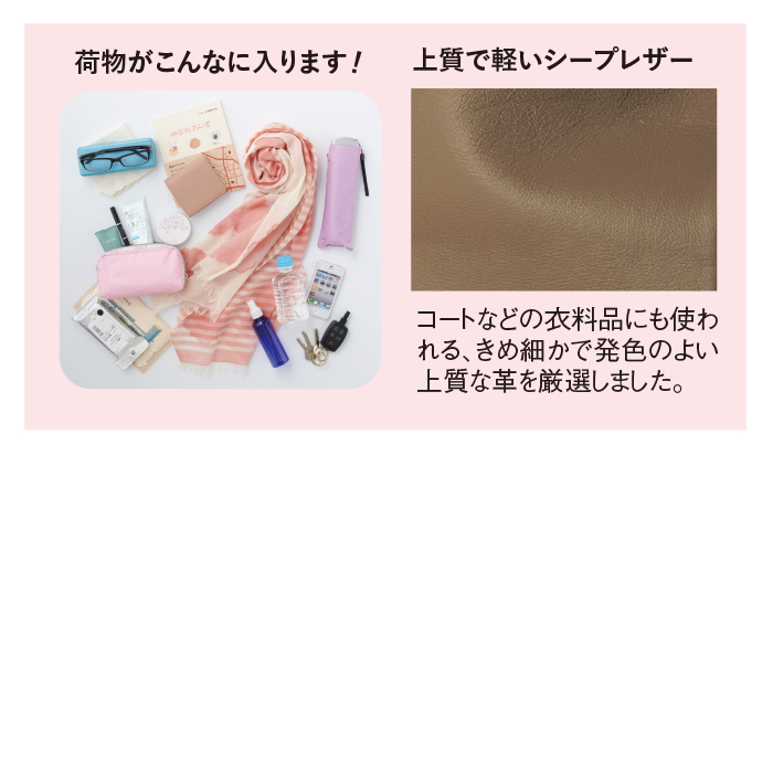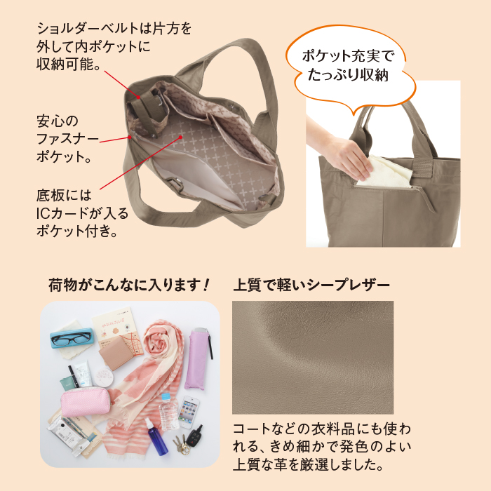 外側:ファスナーポケット×1、底板取り外し可(ICカードポケット付き)、両側スナップボタン付