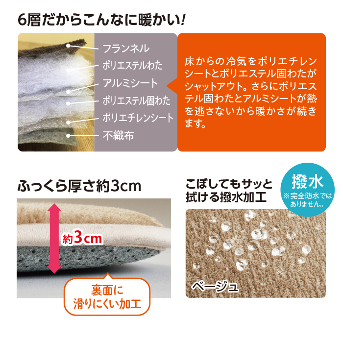 6層構造により、床からの冷気を防ぐ撥水あったかラグ。