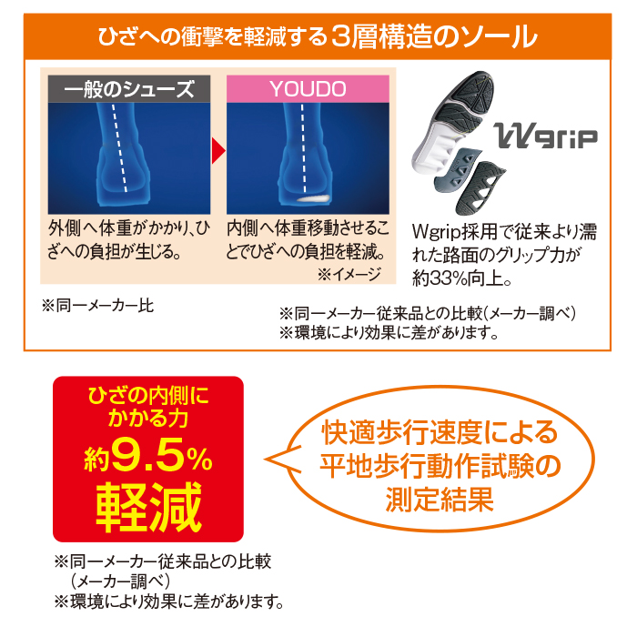 自然に体重を内側に移動させ、ひざの負担を軽減するスニーカー