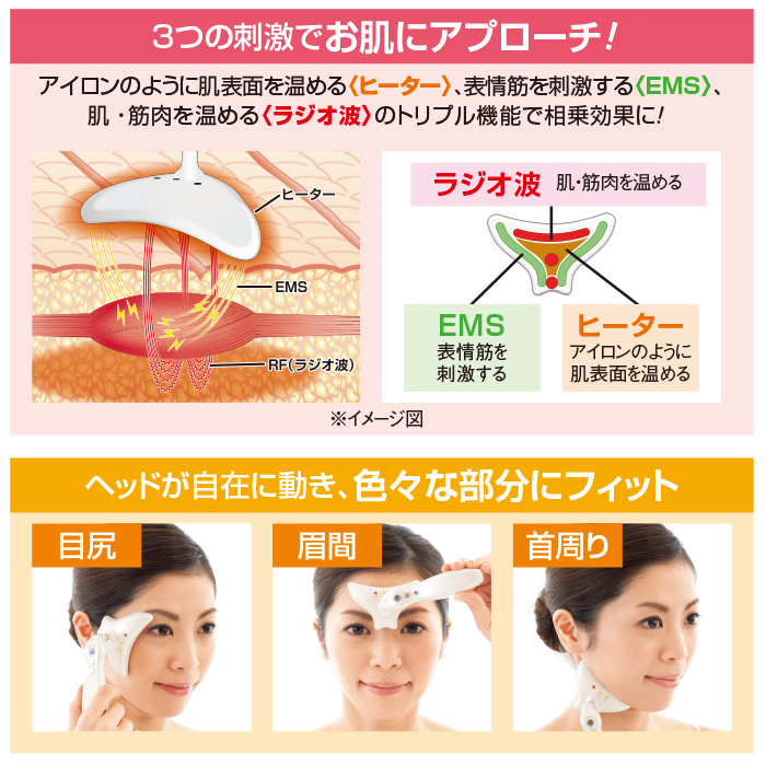 出力切替:HOTモード3段階(弱/中/強)、EMSモード3段階(弱/中/強)、RFモード1段階