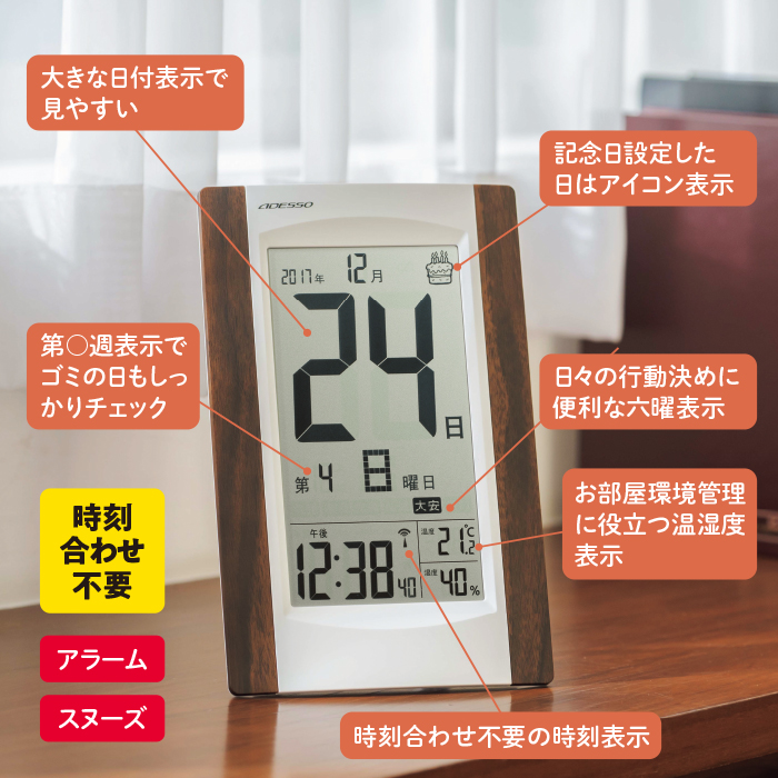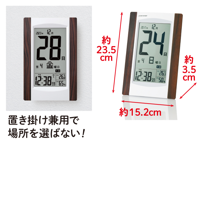 ■セット内容本体、単三電池×2個■商品サイズ約幅15.2×高さ23.5×奥行3.5cm■商品重量約315g■材質・素材・成分ABS樹脂■商品仕様電波時計、アラーム、スヌーズ、日付表示、温度・ 湿度表示、六曜表示、記念日設定置き掛け兼用■保証期間/賞味期限1年間■生産国中国