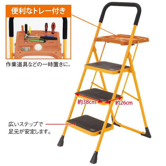 ■商品サイズ約幅58×奥行95×高さ150cm収納時:約幅58×奥行9×高さ164cmステップ板の大きさ:約幅38×奥行26cm■商品重量約12kg■材質・素材・成分スチール(粉体塗装)、ポリプロピレン ■商品仕様完成品耐荷重:(踏み台部)約120kg、(トレー部)約10kg■原産国・製造国中国