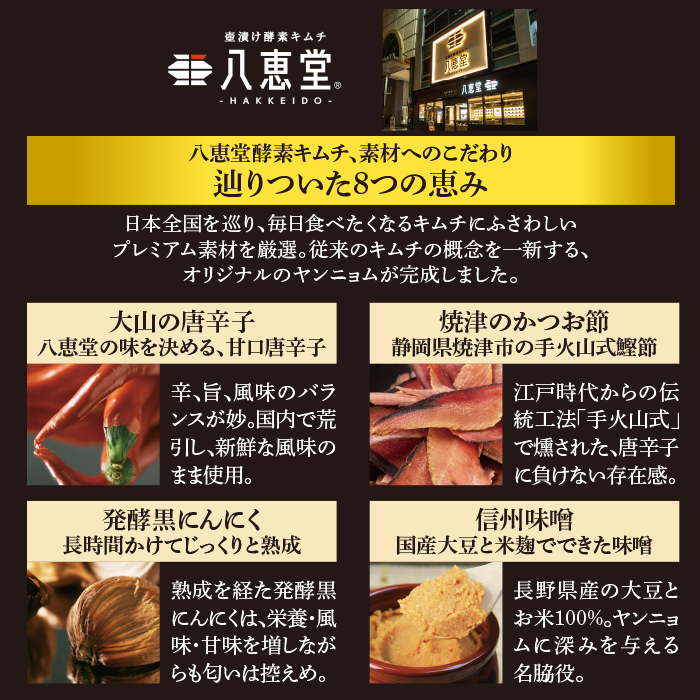 より日本人の食生活に合う味を追求し、日本全国から素材を厳選。保存料や増粘剤を使わずに、菌のバランスを調整したキムチの商品化に成功させました。