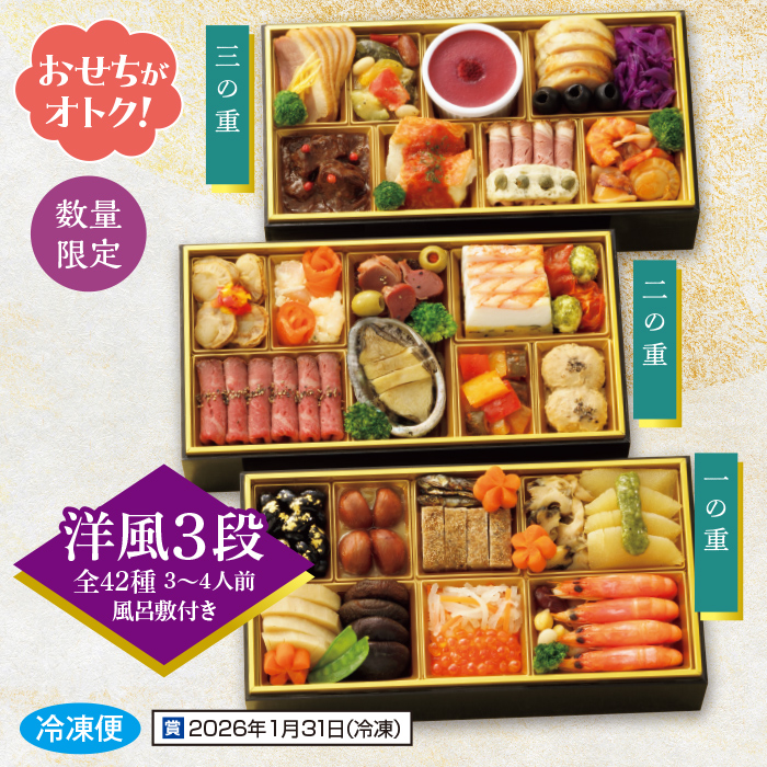 盛り付け済みおせち料理全42種(3-4人前 )×1、風呂敷×1、お品書き×1
