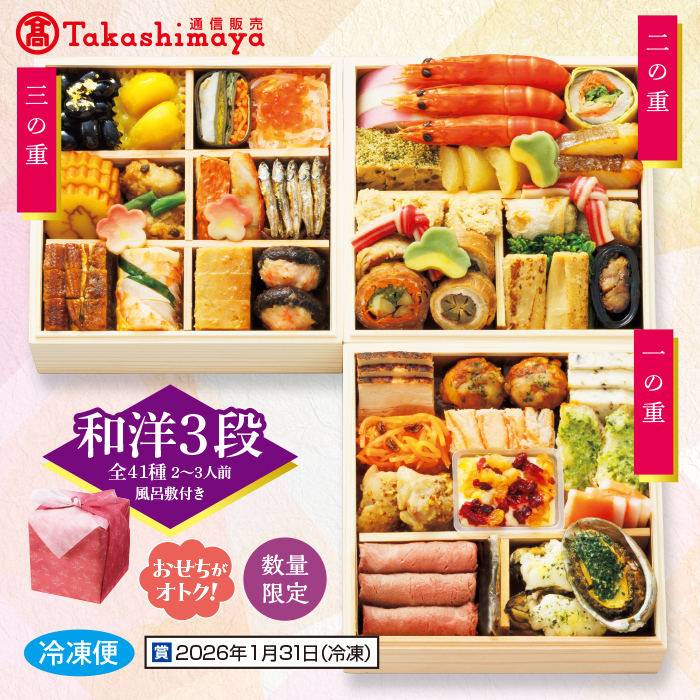 盛り付け済みおせち料理全41種(2-3人前 )×1、風呂敷×1、お品書き×1、原材料一覧表×1