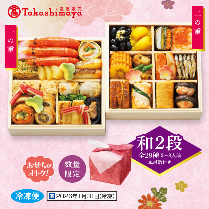 盛り付け済みおせち料理全29種(2-3人前)×1、風呂敷×1、お品書き×1、原材料一覧表×1
