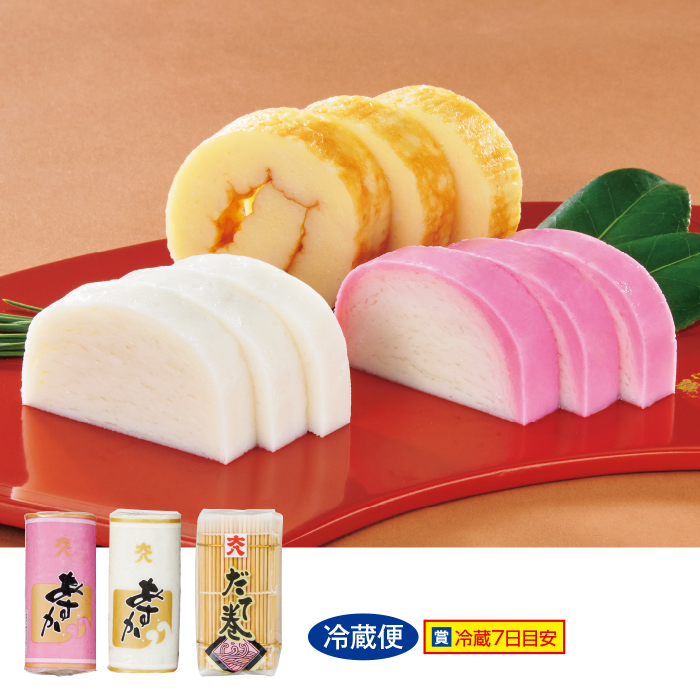 ■セット内容紅蒲鉾(220g)×1、白蒲鉾(220g)×1、伊達巻(260g)×1■アレルギー特定原材料8品目蒲鉾:(紅)小麦、卵、乳、(白)小麦、卵、乳伊達巻:小麦、卵、乳■賞味期限お届け時賞味期限(目安):冷蔵7日目安■生産国加工地:日本