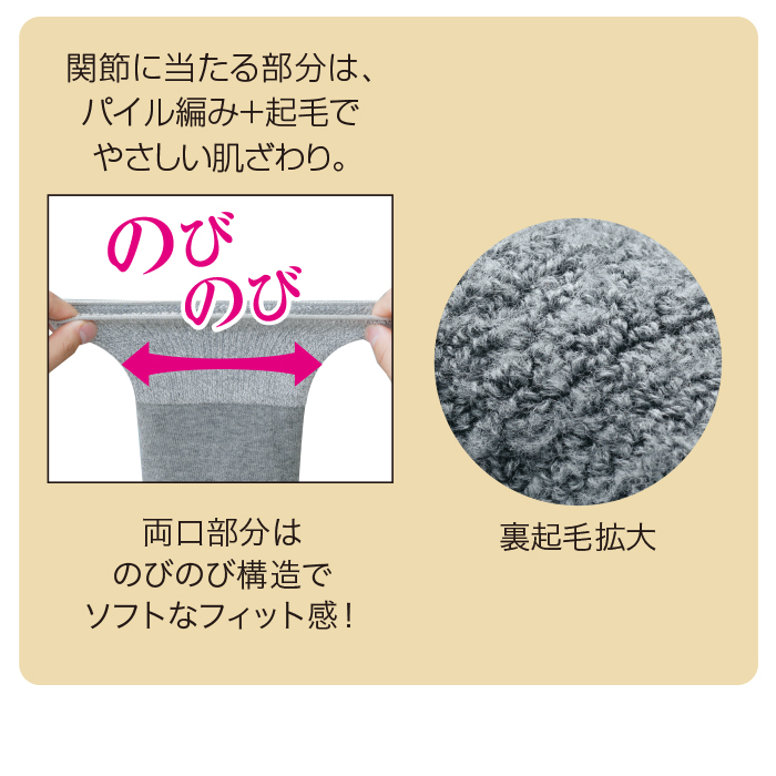 関節に当たる部分は、パイル編み+起毛でやさしい肌ざわり。