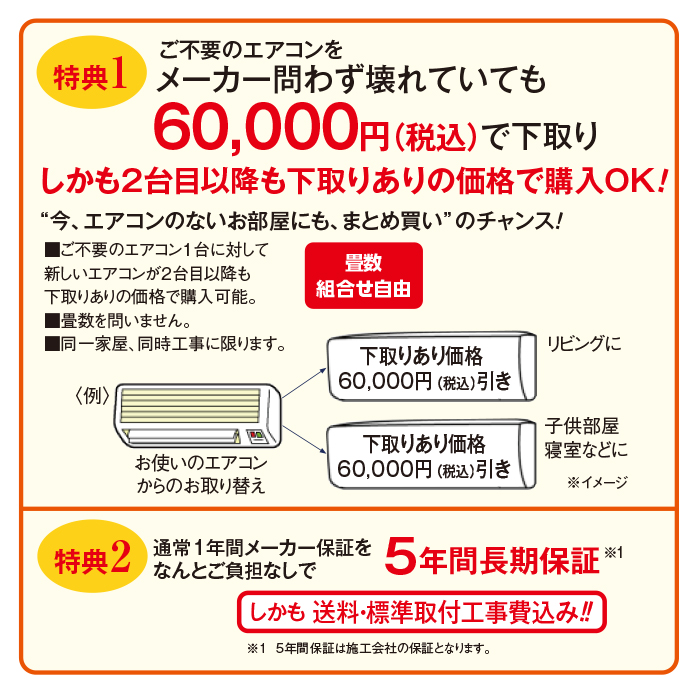 ※ご不要のエアコン1台に対して、新しいエアコン何台でも下取りありの価格で購入できます。同一家屋、同時工事に限ります。