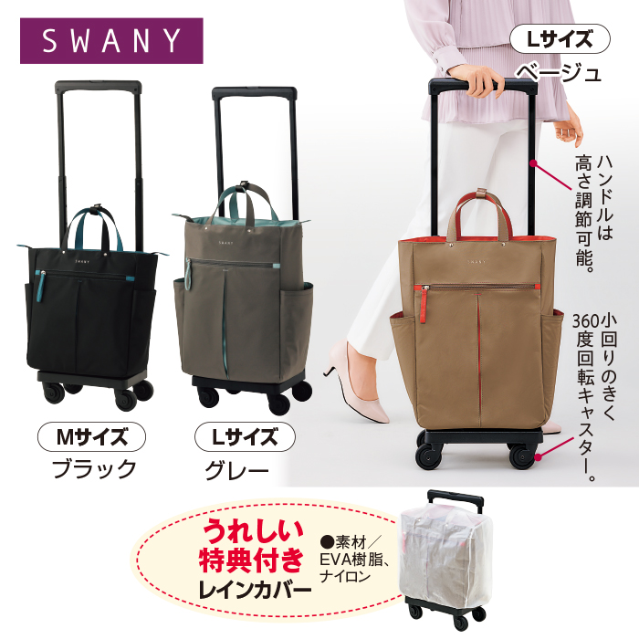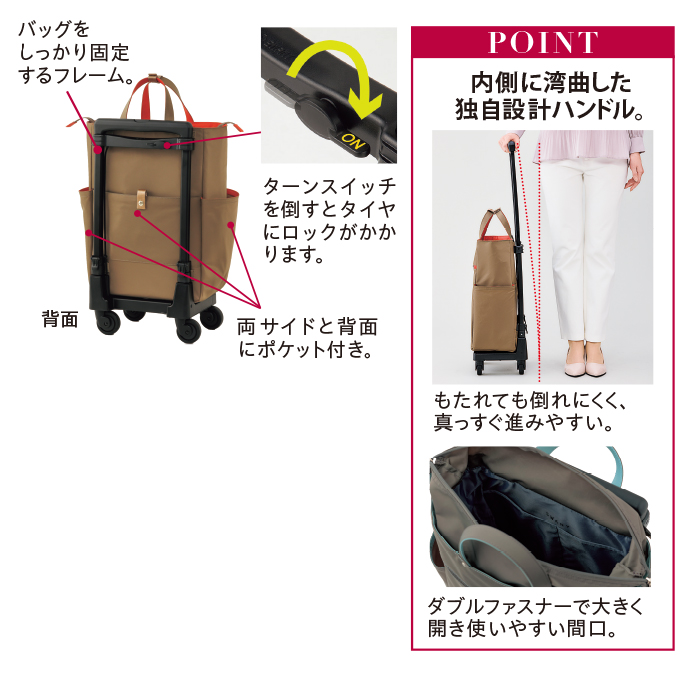 ファスナー式開閉、前面:ファスナーポケット×1、背面:オープンポケット×1、側面:オープンポケット×2、内側:オープンポケット×2、キャスター4個