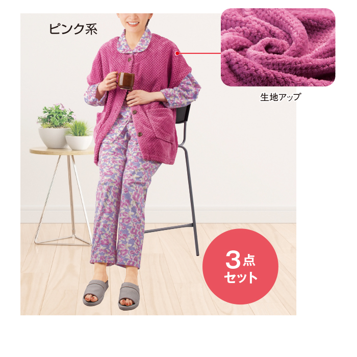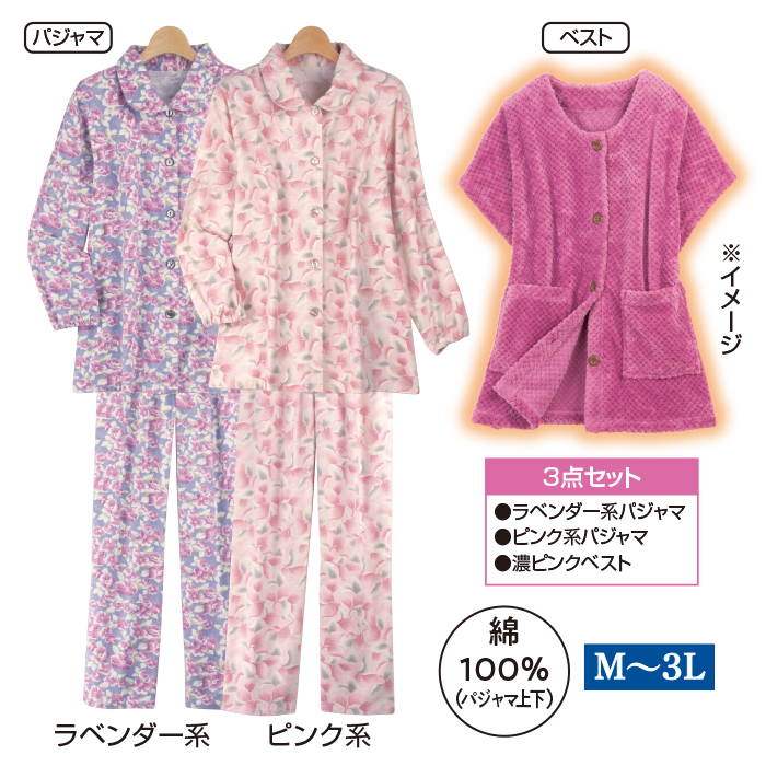 ■セット内容ピンク系パジャマ、ラベンダ-系パジャマ、濃ピンクベスト■材質・素材・成分パジャマ上下:綿100%ベスト:ポリエステル100%■商品仕様上着:袖口ゴムパンツ:ウエスト総ゴム(ゴム取替口あり)■洗濯表示・お手入れ方法洗濯機(ネット使用)■生産国中国■要注意事項※商品により柄の出方が異なる場合があります