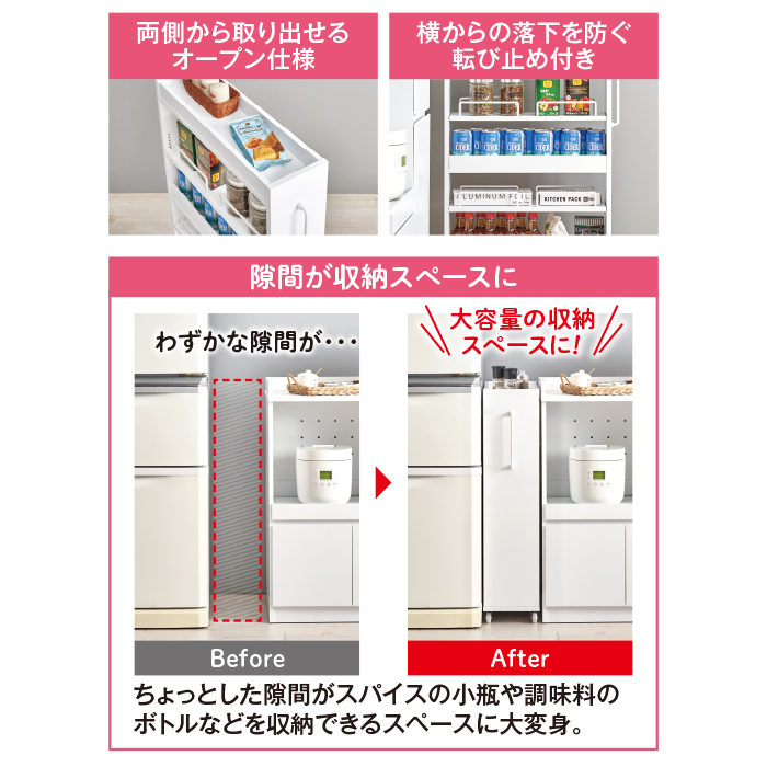 ■商品サイズ約幅16×奥行55(取っ手部含む58)×高さ85cm■商品重量約9kg■材質・素材・成分プリント紙化粧パーティクルボード■商品仕様キャスター付、可動棚×2組立品■生産国マレーシア