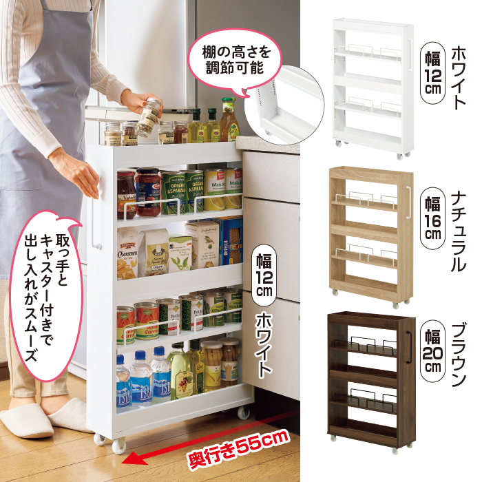 ■商品サイズ約幅20×奥行55(取っ手部含む58)×高さ85cm■商品重量約11kg■材質・素材・成分プリント紙化粧パーティクルボード■商品仕様キャスター付、可動棚×2組立品■生産国マレーシア