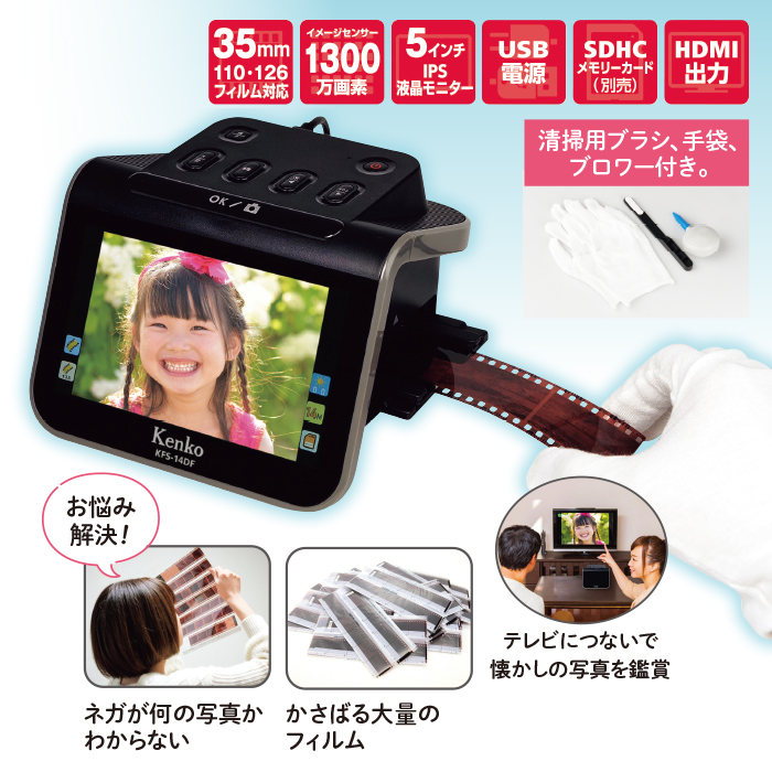本体、マウント用ホルダー、フィルム用アタッチメント(35mm・110・126)各1、USB充電器、USBケーブル、HDMIケーブル、掃除用ブラシ、ブロワー、手袋、取扱説明書