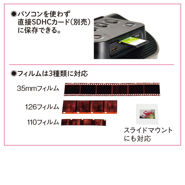 対応フィルム:35mm・110・126(カラーネガ・カラーリバーサル・白黒ネガ、スライドマウント対応)
