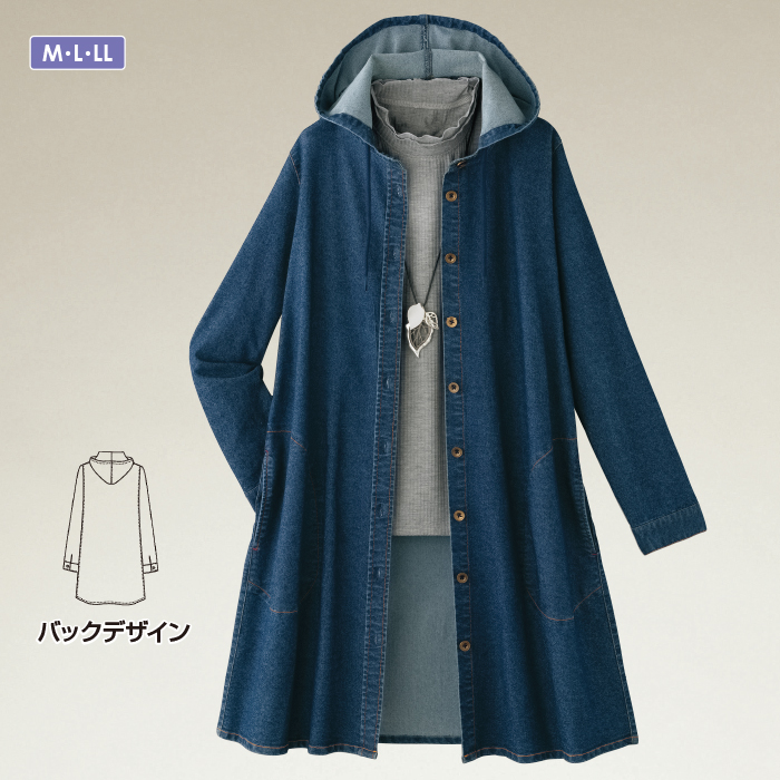 ストレッチデニムの柔らかフード付き羽織りジャケット。