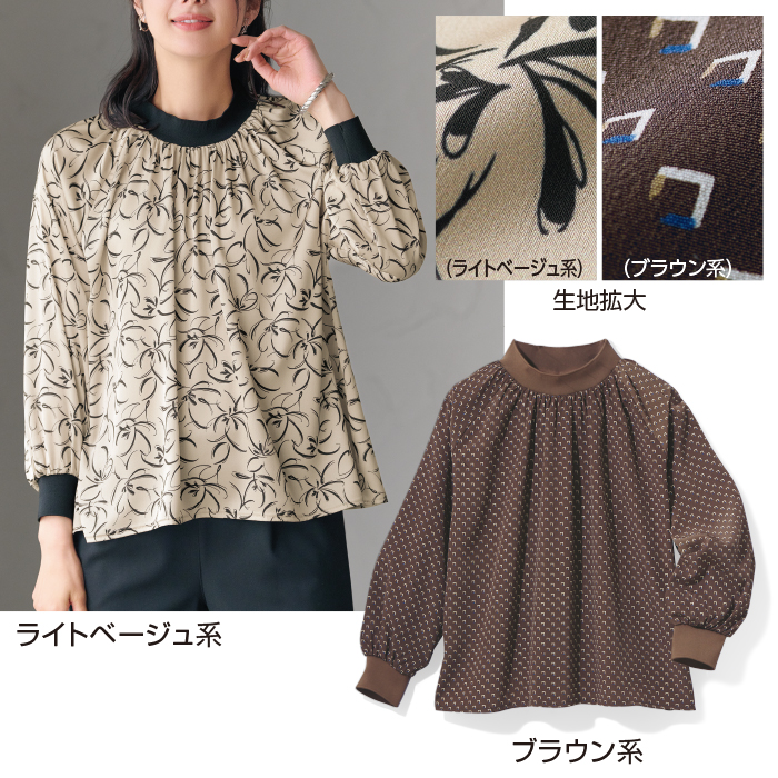 光沢を帯びたプリント生地で、ギャザーを美しく演出。