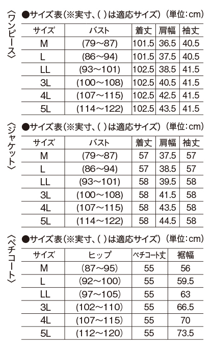 ■セット内容ジャケット、ワンピース、ペチコート■材質・素材・成分ジャケット・ワンピース・ペチコート:ポリエステル100%■商品仕様色:ブラックジャケット:肩パッド付、ワンピース:前ファスナー■洗濯表示・お手入れ方法手洗い■生産国日本