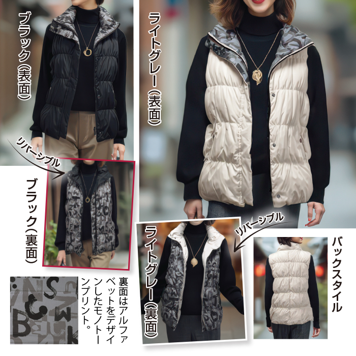 リバーシブル仕様の軽くてあったかダウンベスト。