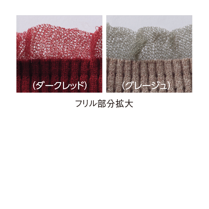 ■材質・素材・成分本体:レーヨン50%、ポリエステル30%、ナイロン20%フリル部分:ポリエステル100%■洗濯表示・お手入れ方法手洗い■生産国中国■要注意事項※着用中の摩擦や洗濯により、毛羽立ちや毛玉(ピル)が生じることがあります。※アクセサリーは参考商品です。