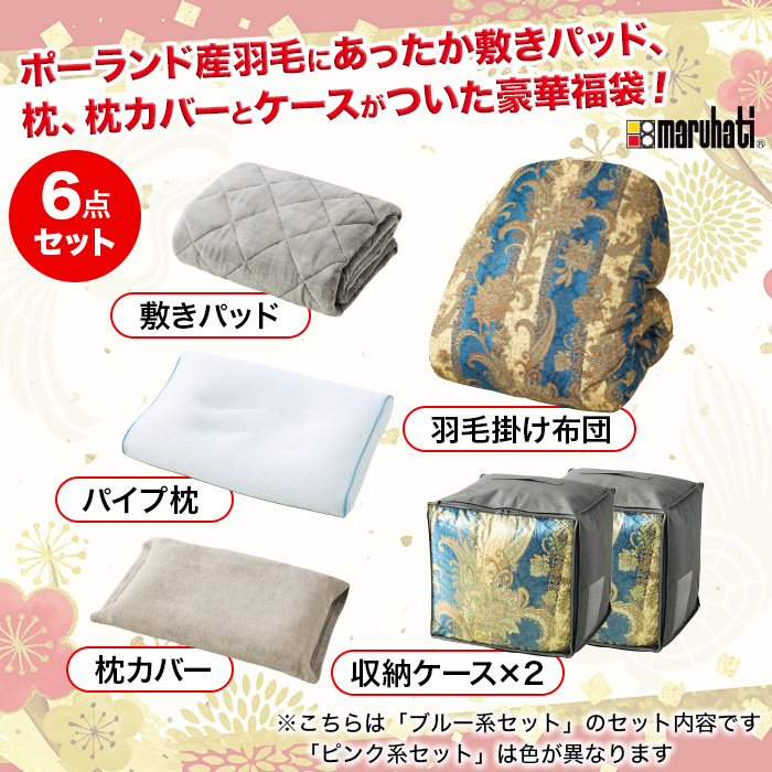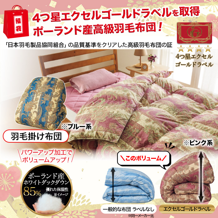 羽毛掛け布団=側生地:ポリエステル85%・綿15%、 詰め物:ポーランド産ホワイトダックダウン85%・フェザー15%
