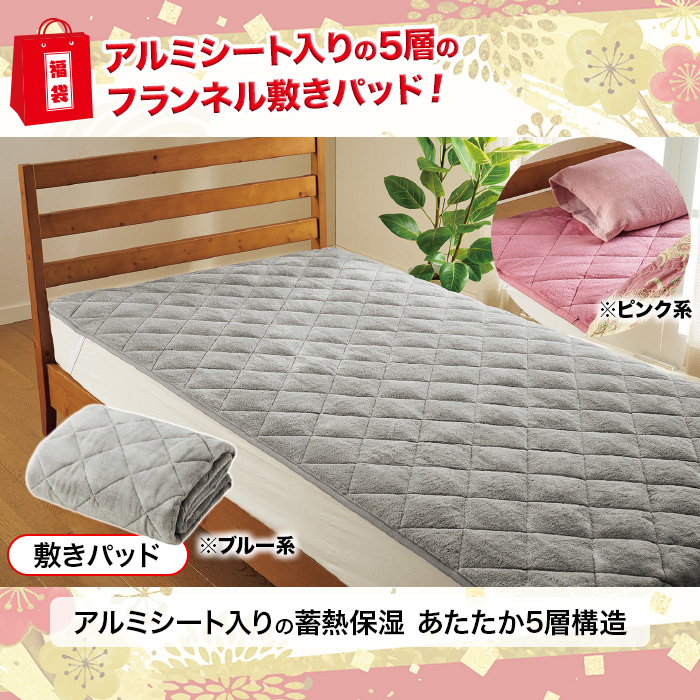 敷きパッド=側生地:ポリエステル100%、詰め物:ポリエステル100%(詰め物の上にアルミ蒸着不織布使用)