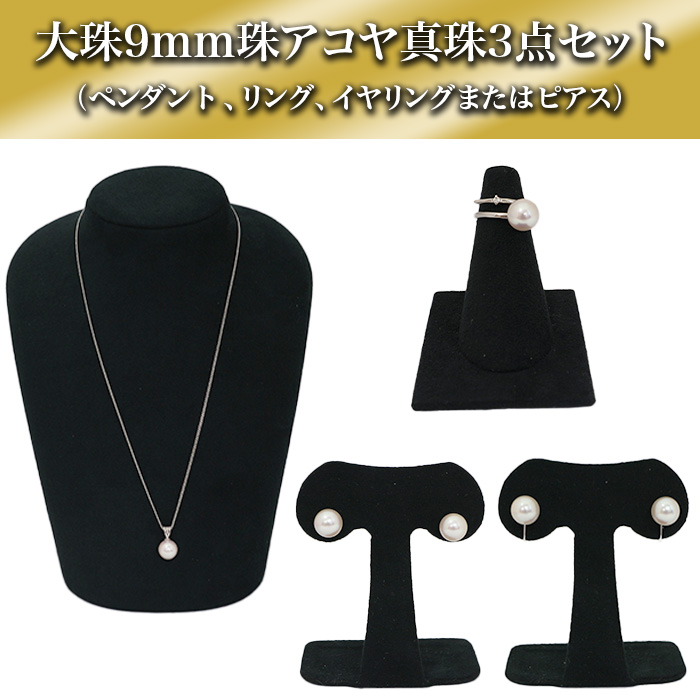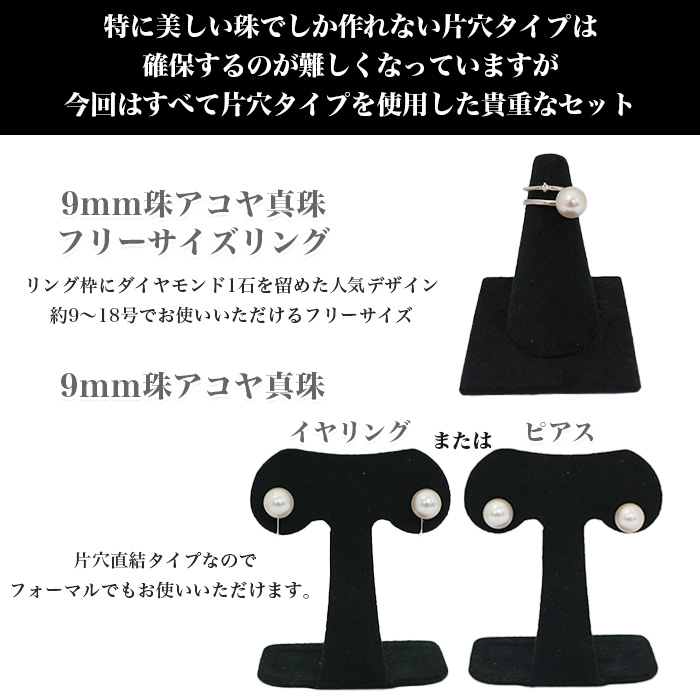 9mm珠アコヤ真珠ペンダント、9mm珠アコヤ真珠イヤリング/ピアス、9mm珠アコヤ真珠フリーサイズリング、ケース