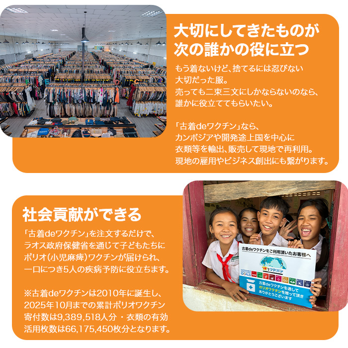 【社会貢献ができる】「古着deワクチン」を注文するだけで、ラオス政府保健省を通じて子どもたちにポリオ(小児麻痺)ワクチンが届けられ、一口につき5人の疾病予防に役立ちます。※古着deワクチンは2010年に誕生し、2025年10月までの累計ポリオワクチン寄付数は9,389,518人分・衣類の有効活用枚数は66,175,450枚分となります。