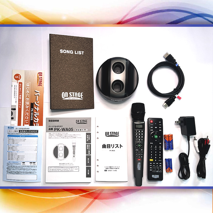 ワイヤレスマイク(1本)、スタンドベース(800曲内蔵)、リモコン、ACアダプター、音声出力用接続コード、HDMIケーブル(約1.5m)、バインダーソングリスト、基本操作早見表、取扱説明書(保証書一体)、単4形アルカリ乾電池(リモコン用)×2本、単3形アルカリ乾電池(マイク用)×2本