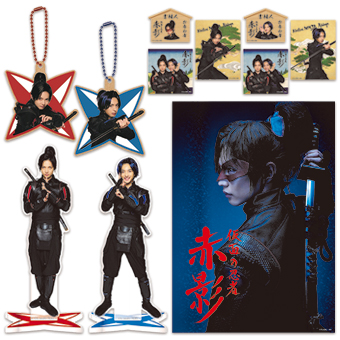 忍者らしいポーズのアクリルスタンド2種、3枚セットのダイカットステッカー2種、刀を構えたキリリとした表情が楽しめる木製キーホルダー2種、そしてポスタービジュアルの背景を和紙風にデザインした赤影のクリアポスターを加えた全7種類。
